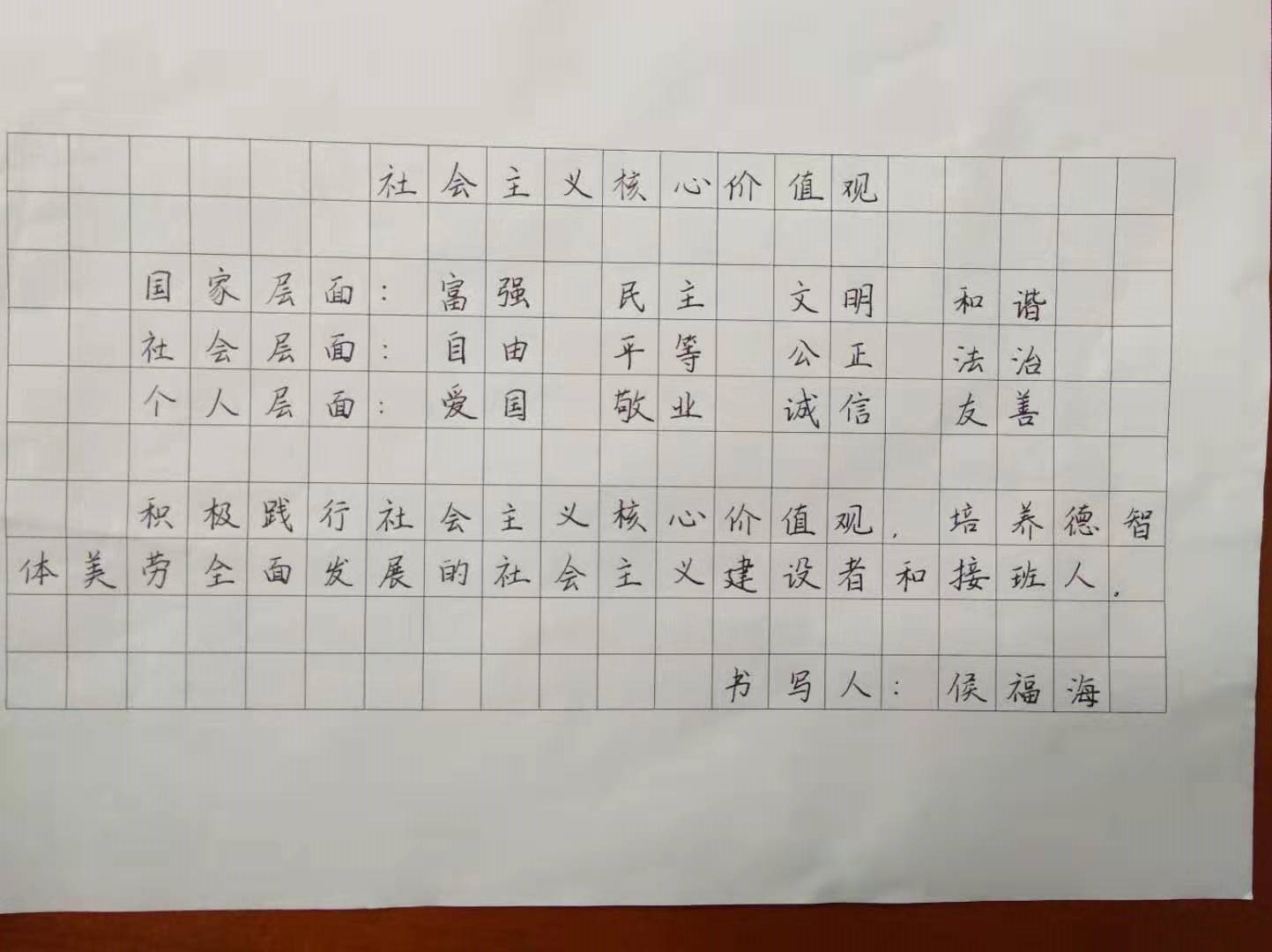 1、每位老师上交一份软笔或硬笔书法作品,内容在“八礼四仪”“社会主义核心价值观”“文明校园创建六个好”中任选其一。
