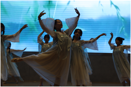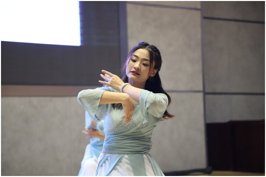 吕婉婷、许琪、张诗彤三位新教师带来的舞蹈《繁花》裙似飞鸾,袖如回雪,裙袖舞动,飘摇曳曳。她们将中华几千年的文化和历史精彩演绎,为古典舞注入一缕缕青春的气息。带领大家一起步入古风独有的雅致意境。