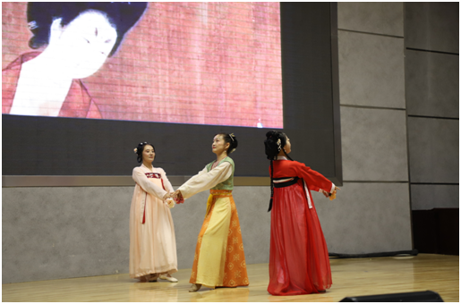 云想衣裳花想容,春风拂槛露华浓。若非群玉山头见,会向瑶台月下逢。由殷晓倩、沈银芳、刘怡昀三位老师表演的舞蹈《簪花》将大家又带回中华悠久文明的历史画卷之中。晨起簪花,听其自择,喜红则红,爱紫则紫,随心插戴,宛如梦境,大家完全陶醉其中。