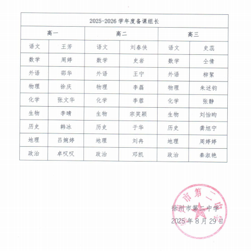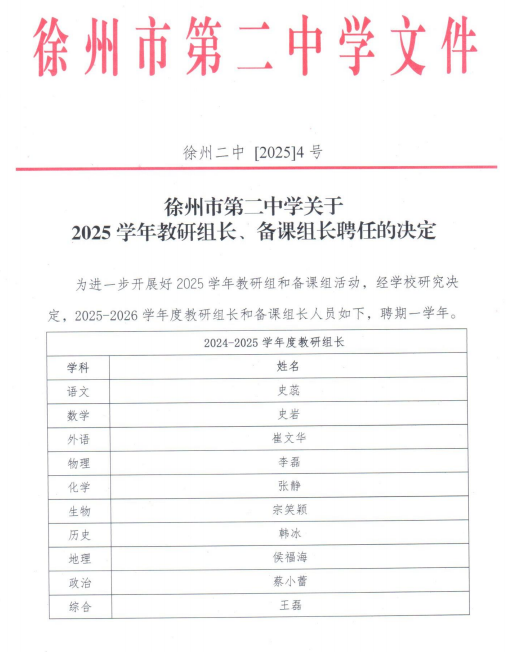 徐州市第二中学关于2025学年教研组长、备课组长聘任的决定