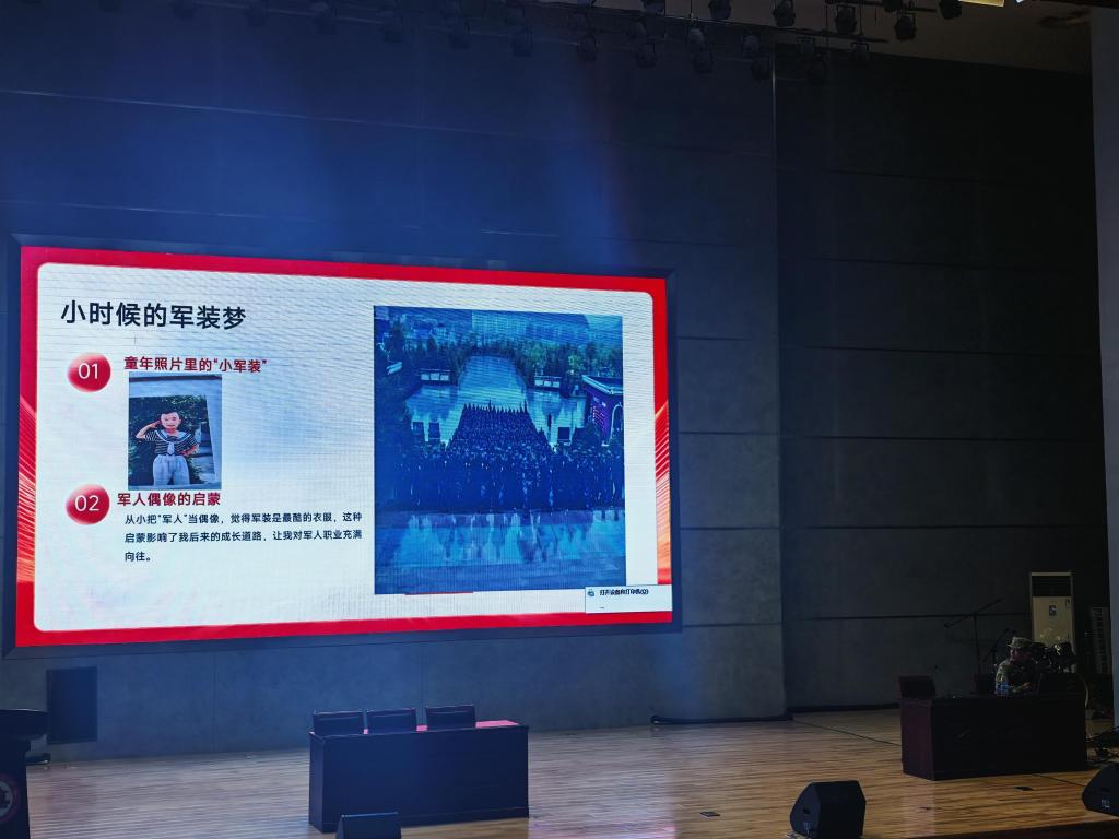 随后,主讲人以“我的成长——从校服到军装”为主题,深情分享了自己的心路历程。他讲述了从一名普通青年学生如何怀抱报国理想,历经严格选拔与考核,最终穿上梦寐以求的军装,成为一名军校学员的蜕变故事。故事中既有对校园生活的留恋,更有对军旅生涯的向往与坚定,其真挚的情感引起了在场许多同学的共鸣。
