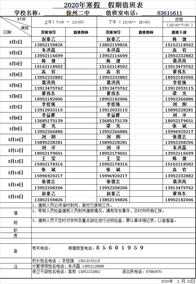 2020年3月1日-3月15日值班表