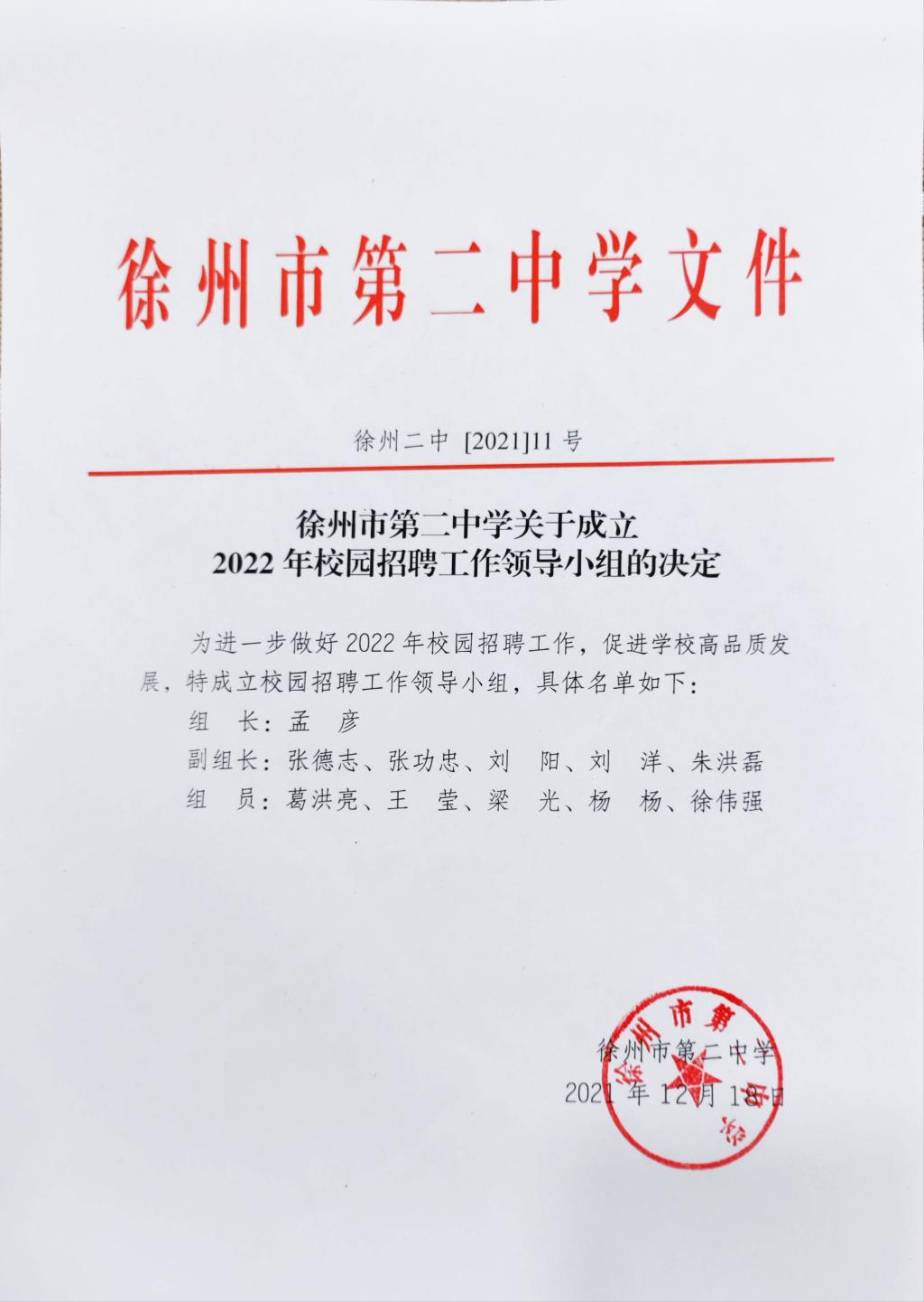 徐州市第二中学关于成立2022年校园招聘工作领导小组的决定