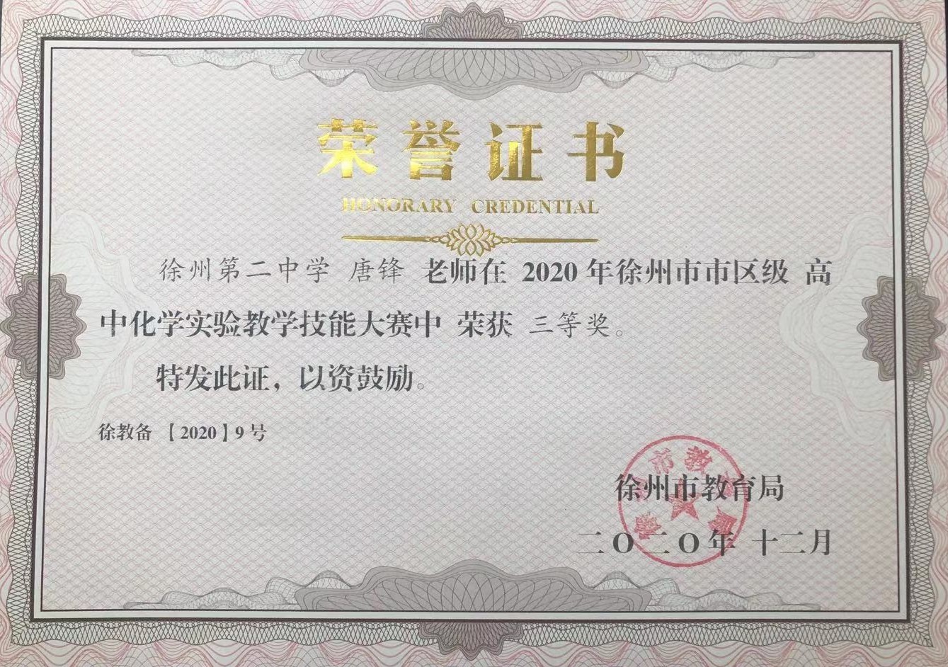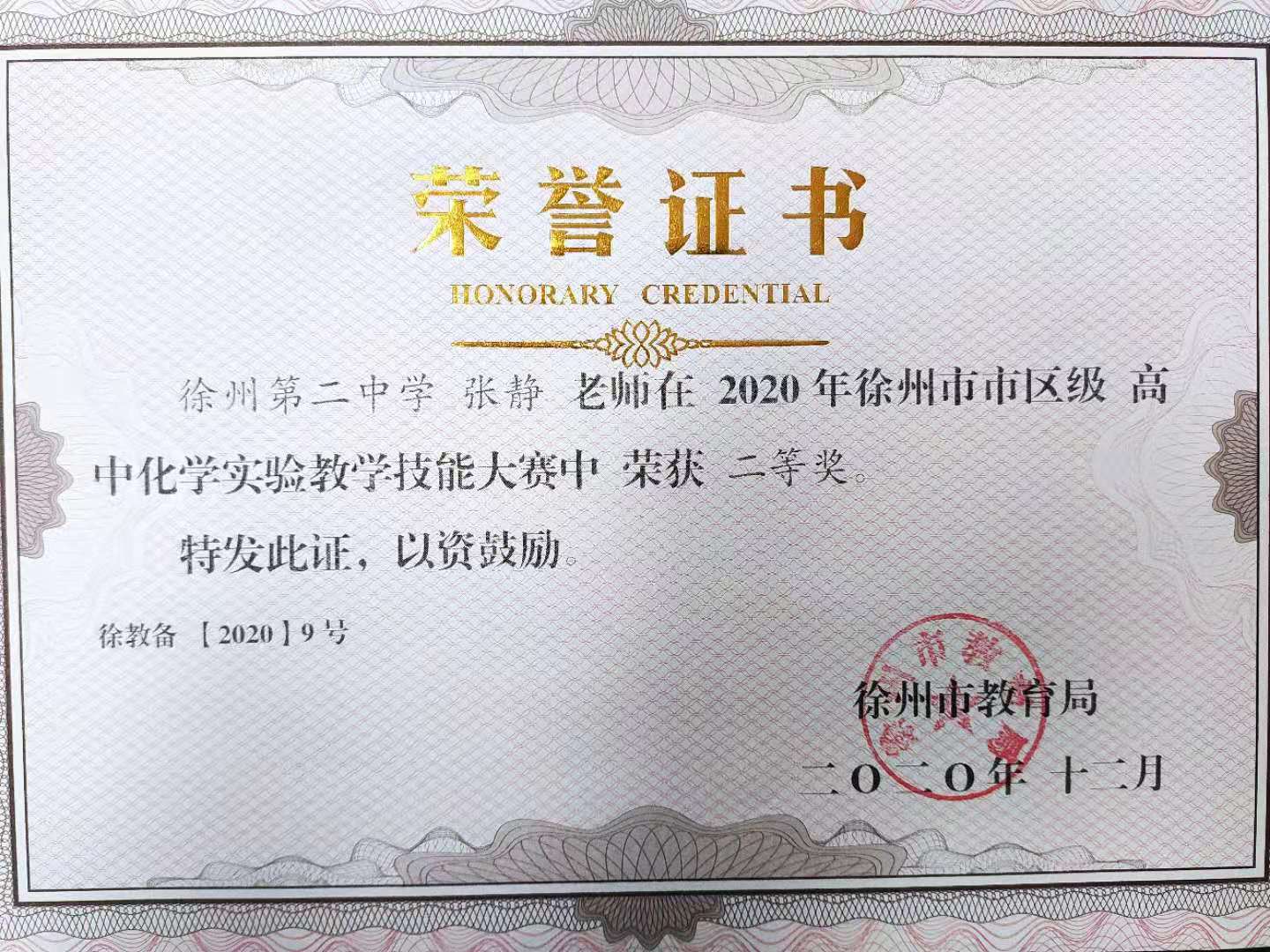 在2020年度徐州市高中化学实验教学技能大赛中,我校获得团体二等奖,张静老师获二等奖,唐锋老师获三等奖,在此向两位老师表示祝贺,并向全校师生报喜。