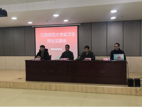 见面会上,马博主任介绍了学校的基本情况、历史沿革、发展规划。接着刘阳副校长介绍了学校文化理念,用六个“好”概括了学校特色,对实习生提出了学校的要求。郝天豪老师介绍了江苏师范大学的发展历程、带队老师和实习生的情况,对实习生提出了希望。最后赵秦乙主任介绍了19位学科及班主任指导教师,实习生与指导教师分组互动。