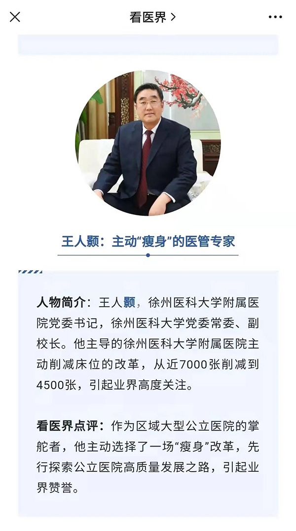 《看医界》介绍王人颢书记为“主动‘瘦身’的医管专家”,认为“他主导的徐州医科大学附属医院主动削减床位的改革,从近7000张削减到4500张,引起业界高度关注”,并点评王人颢书记“作为区域大型公立医院的掌舵者,他主动选择了一场“瘦身”改革,先行探索公立医院高质量发展之路,引起业界赞誉”。