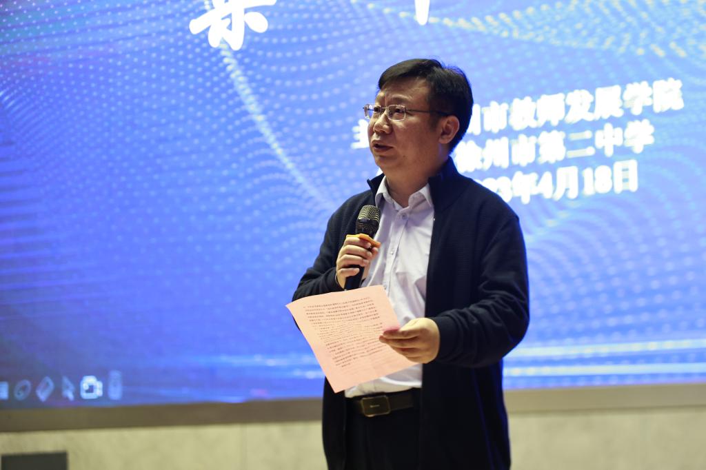徐州二中党委书记、校长孟彦致欢迎辞,向市教育局、市教师发展学院领导的信任表示感谢,向与会的各位领导、专家、同仁表示欢迎。2021年,二中获评“江苏省教师发展示范基地校”、“江苏省教科研先进集体”,2022年在省教师发展示范基地校中期考核中获优秀等次,以江苏省教学名师崔文华老师为代表的一大批优秀教师脱颖而出,为学校发展提供了坚强保障。孟校长表示二中将继续把教师队伍建设摆在优先发展的地位,为徐州教育高质量发展作出贡献。