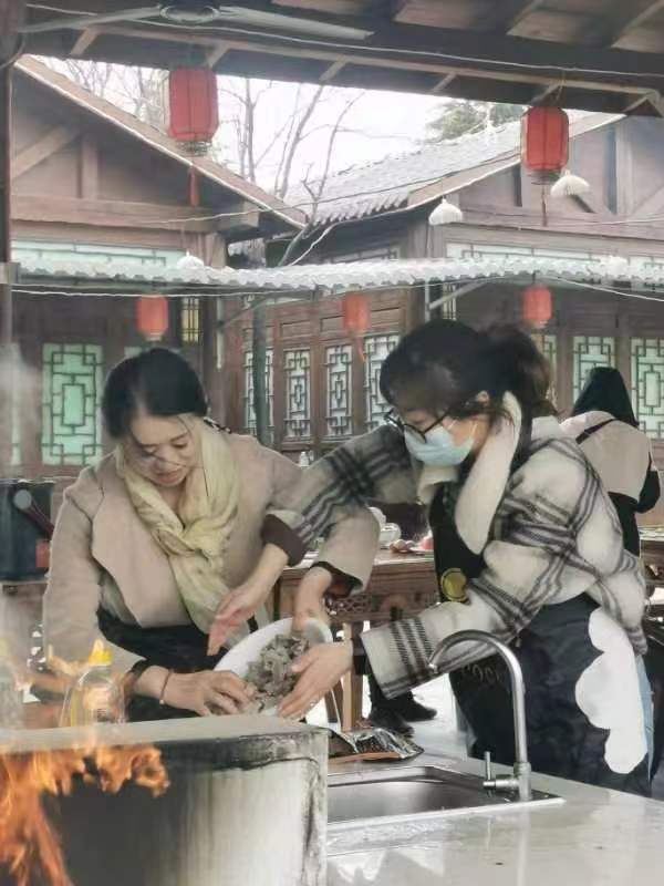 团建项目结束后,教职工们有的找一处安静的角落坐着休息,放空一下自己的身心;有的三三两两地漫步在乡村古道上,或驻足拍照,或欣赏美景。