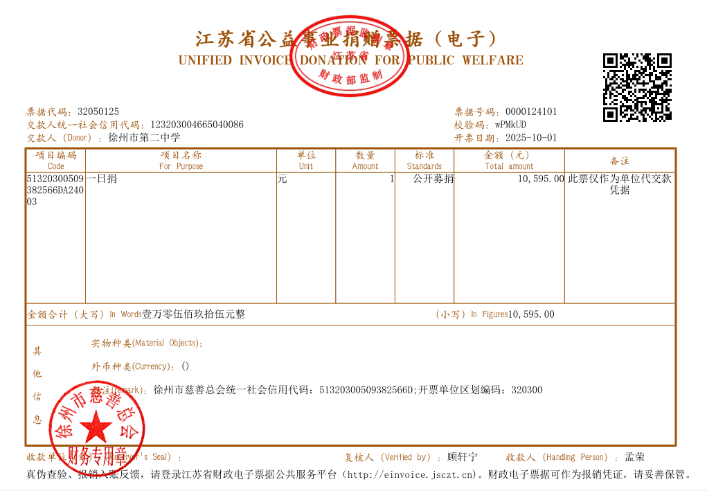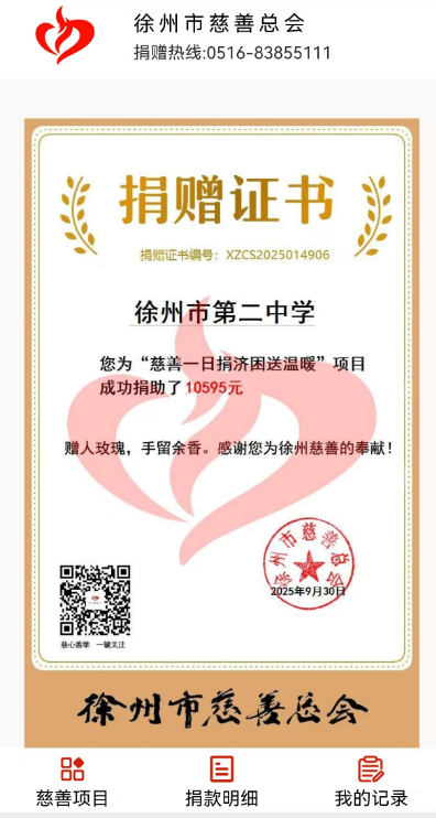 为贯彻落实习近平总书记关于民生工作和慈善事业重要讲话与指示精神,引导和激励人们乐善好施、崇德向善,我校工会依据相关文件工作要求,近期组织开展了2025年度“慈善一日捐活动,教职员工共计捐款10595元。学校工会及时把募捐情况公示并将捐款全部上交徐州市慈善总会。