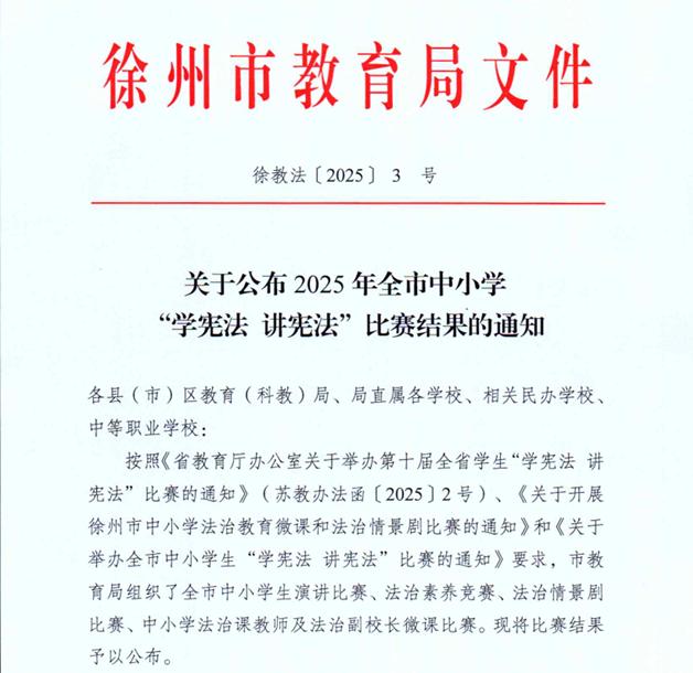 近日,2025年徐州市中小学生“学宪法、讲宪法”比赛结果正式揭晓。我校选派参赛的两名优秀学子凭借出色表现,双双荣获一等奖,为学校赢得了荣誉。其中,刘小卓同学在演讲比赛中折桂,史迪炆曹同学在素养竞赛中夺魁,充分展示了我校在青少年法治教育和综合素质培养方面的丰硕成果。