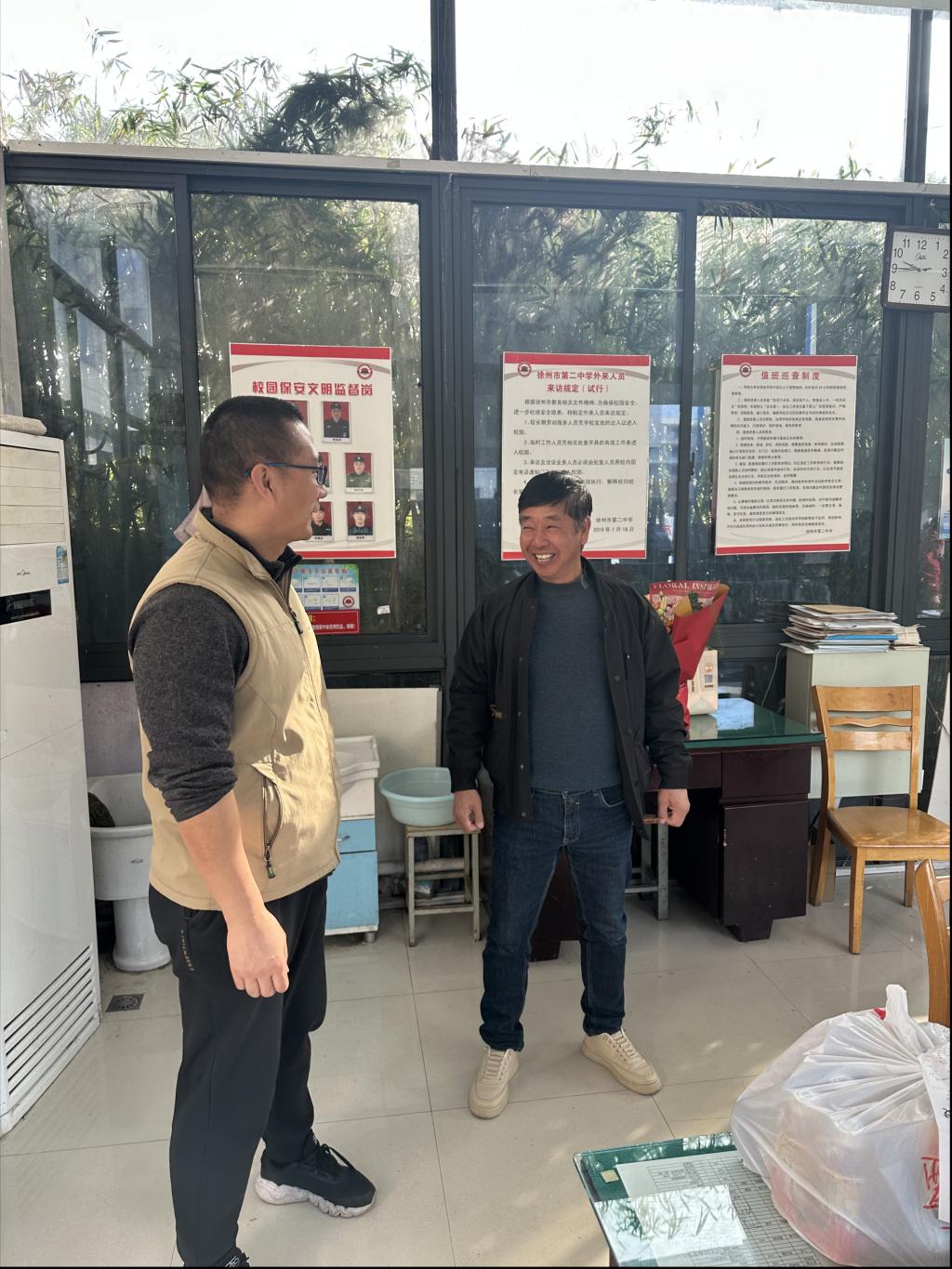 欢送仪式在蒋师傅曾星夜值守的岗位上进行。校领导们与蒋师傅并肩而立,回顾了他自入职以来近两千个日夜的坚守与付出。王运思书记和刘阳校长对蒋师傅六年多来的工作给予了高度认可和衷心感谢,称赞他是校园安全的“忠诚卫士”,以高度的责任心和友善的态度,为平安校园建设作出了扎实贡献。