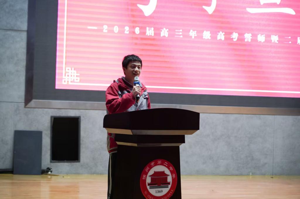 校党委书记王运思发表热情洋溢的致辞。他深情回顾了同学们三年来的成长点滴,从晨光熹微中的诵读到夜深人静时的演算,每一份坚持都值得被铭记。面对最后的冲刺阶段,他向全体高三学子提出三点希望:坚定信念、心无旁骛;科学备考、脚踏实地;调整心态、从容自信。他勉励同学们以“天生我材必有用”的信心、“吹尽狂沙始到金”的毅力、“直挂云帆济沧海”的豪情,全力以赴备战即将到来的二质检,奋力冲刺六月高考。王书记的话语铿锵有力,字字千钧,赢得了全场阵阵掌声。