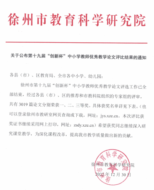 在徐州市第十九届“创新杯”中小学教师优秀教学论文评选中,我校共10位老师获奖,在此向他们表示祝贺,并向全校师生报喜。