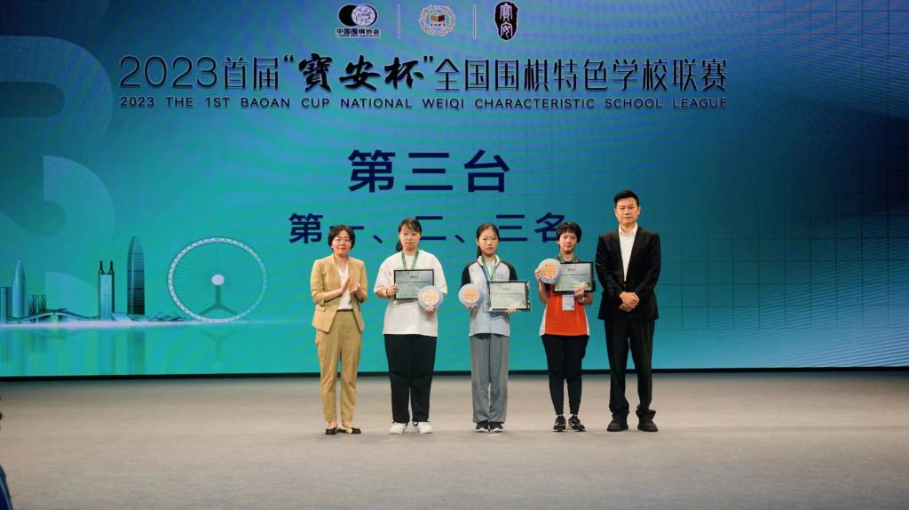 中国围棋协会名誉主席王汝南、中国首位围棋世界冠军马晓春九段、广东省围棋协会监事长廖桂永九段、围棋世界冠军孔杰九段、深圳市和宝安区教育局有关领导出席了比赛闭幕仪式并与获奖团队及选手合影留念。
