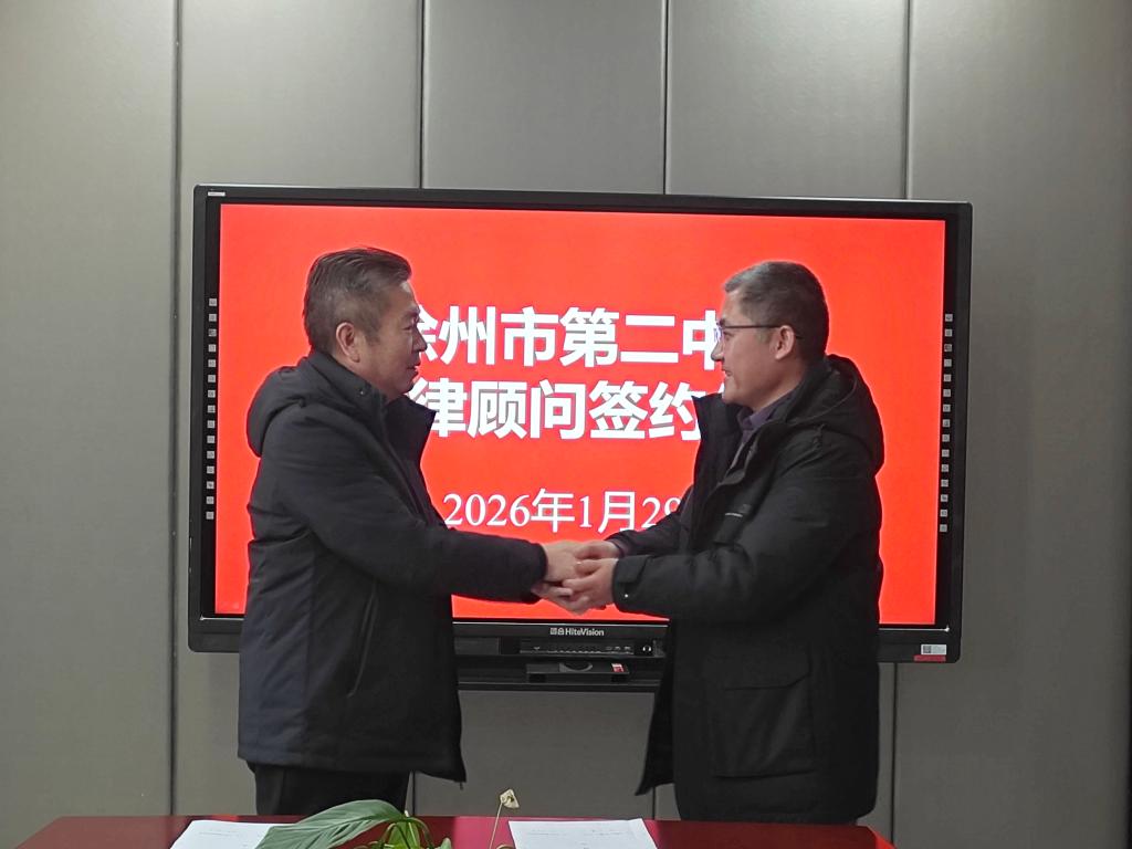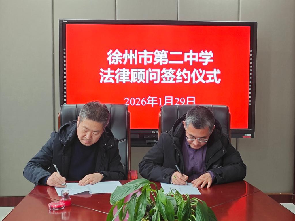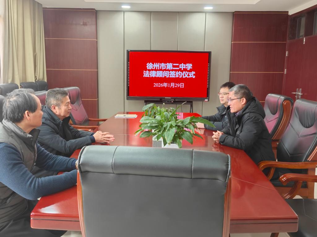 2026年1月29日14时,徐州市第二中学法律顾问聘任仪式在务本楼306会议室隆重举行。作为徐州市平安校园示范校,学校此次携手江苏宁致律师事务所,搭建专业法治保障平台,为校园安全稳定、办学规范有序筑牢法律防线。学校党委书记王运思,党委副书记、校长刘阳,党委委员、副校长齐永发出席仪式,仪式上刘阳校长代表学校与江苏宁致律师事务所代表宋怀德律师正式签署法律顾问协议。
