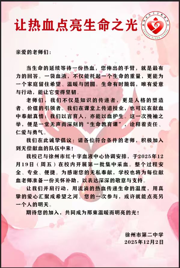 此次活动进一步增强了我校教职工的社会责任意识和公益服务观念,充分展现出徐州二中教职工勇于担当、乐于奉献的精神风貌。大家以热血传递爱心,为社会注入了一份温暖力量。